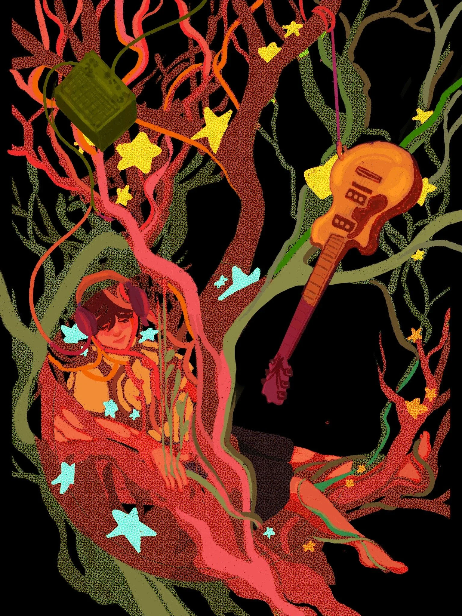Izza is a mixed-media illustrator who brings bold, surreal visuals to life through vibrant colors, dramatic perspectives, and a touch of the absurd. Their work spans a variety of formats, from skate graphics to triptychs, comics, visual essays, and mixed-media projects that blend illustration and animation. They have a deep love for analog textures, often painting with gouache and enhancing it digitally to create rich, layered compositions with a "crunchy" feel. At its core, Izza’s work is about storytelling—exploring the body, identity, and the unexpected connections between the organic and the man-made.